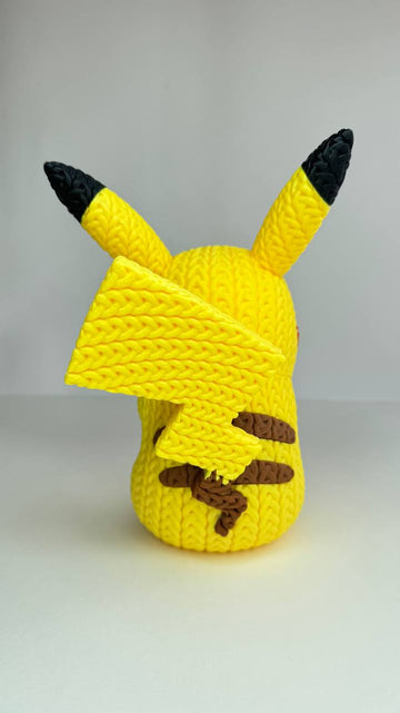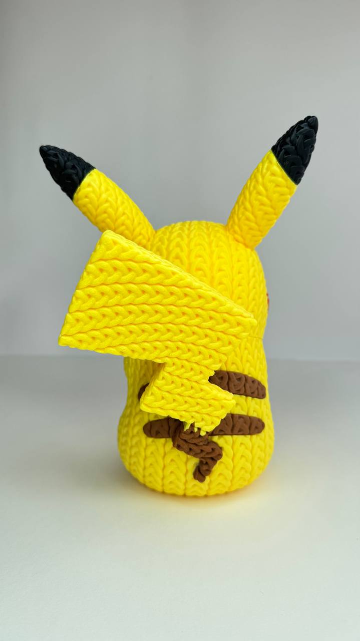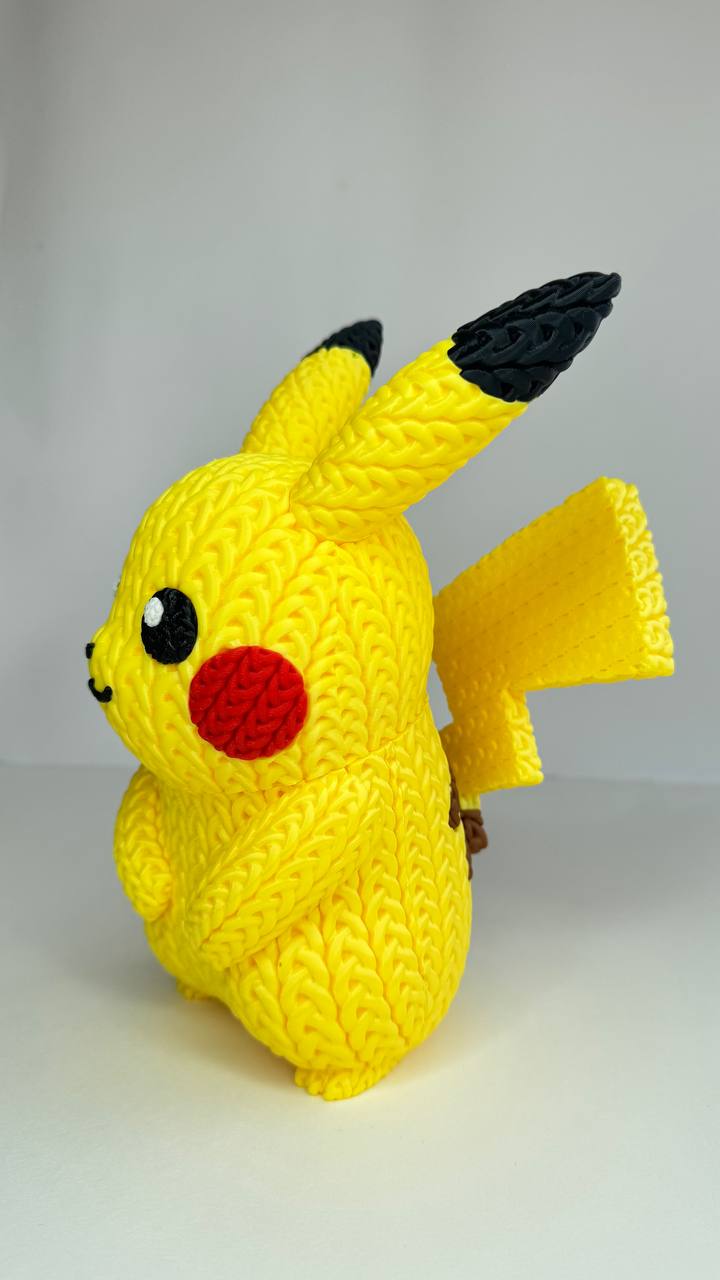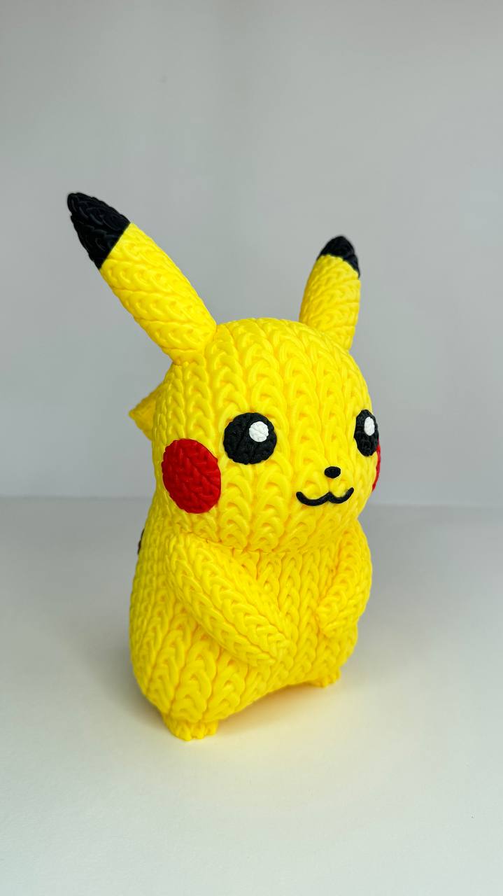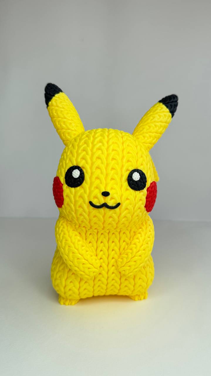 Стилізована фігурка Пікачу у в’язаному стилі — це яскрава та затишна інтерпретація улюбленого персонажа. Об’ємна «в’язана» текстура створює ефект м’якої іграшки, хоча сама фігурка надрукована на 3D-принтері й має високу деталізацію.