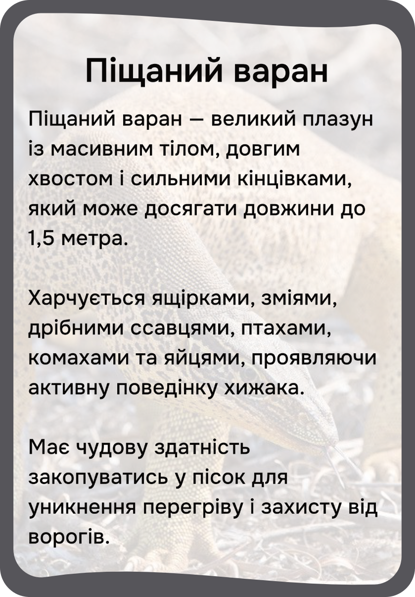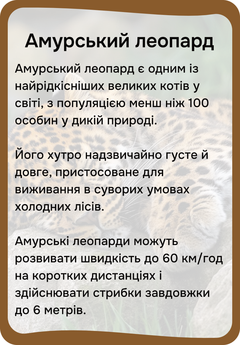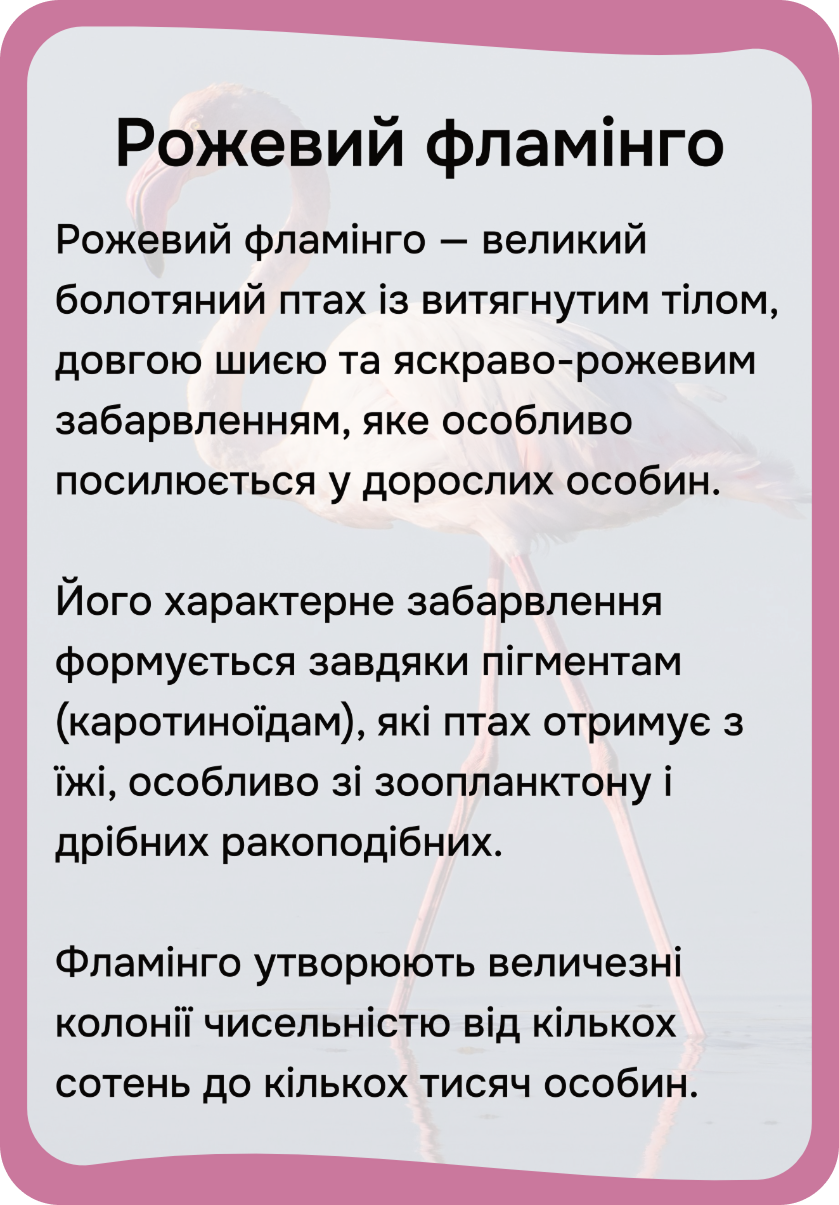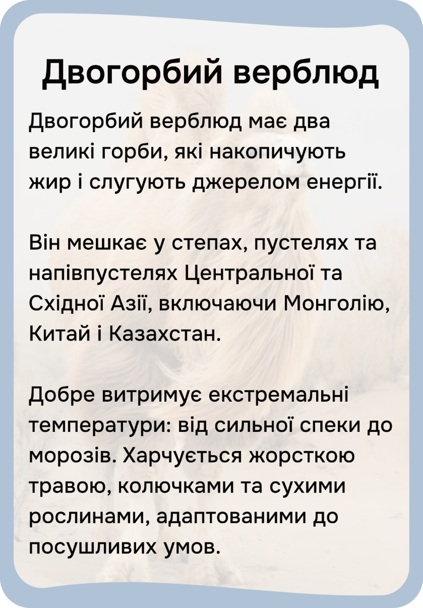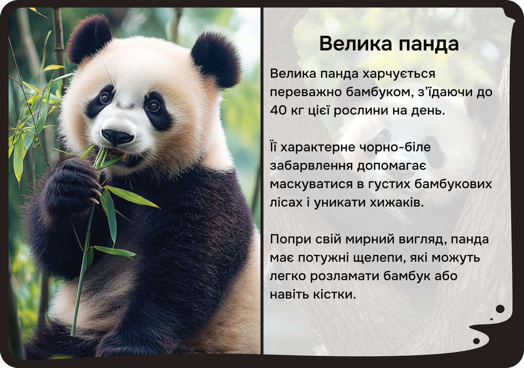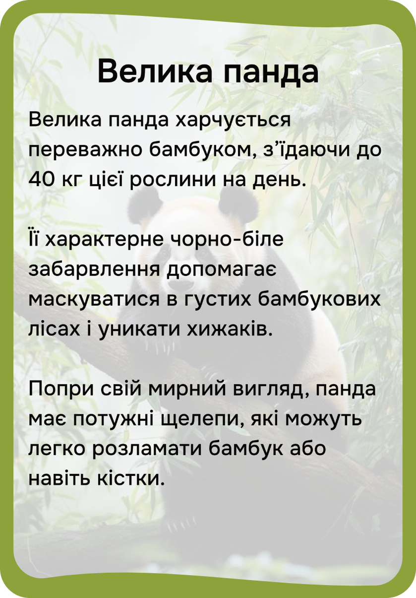 Завдяки яскравим ілюстраціям та цікавим описам діти дізнаються, як тварини пристосовуються до різних умов, чим вони харчуються, де живуть і які унікальні особливості роблять кожен вид неповторним. Ці картки розвивають допитливість, любов до природи та допомагають краще зрозуміти різноманіття життя на нашій планеті.