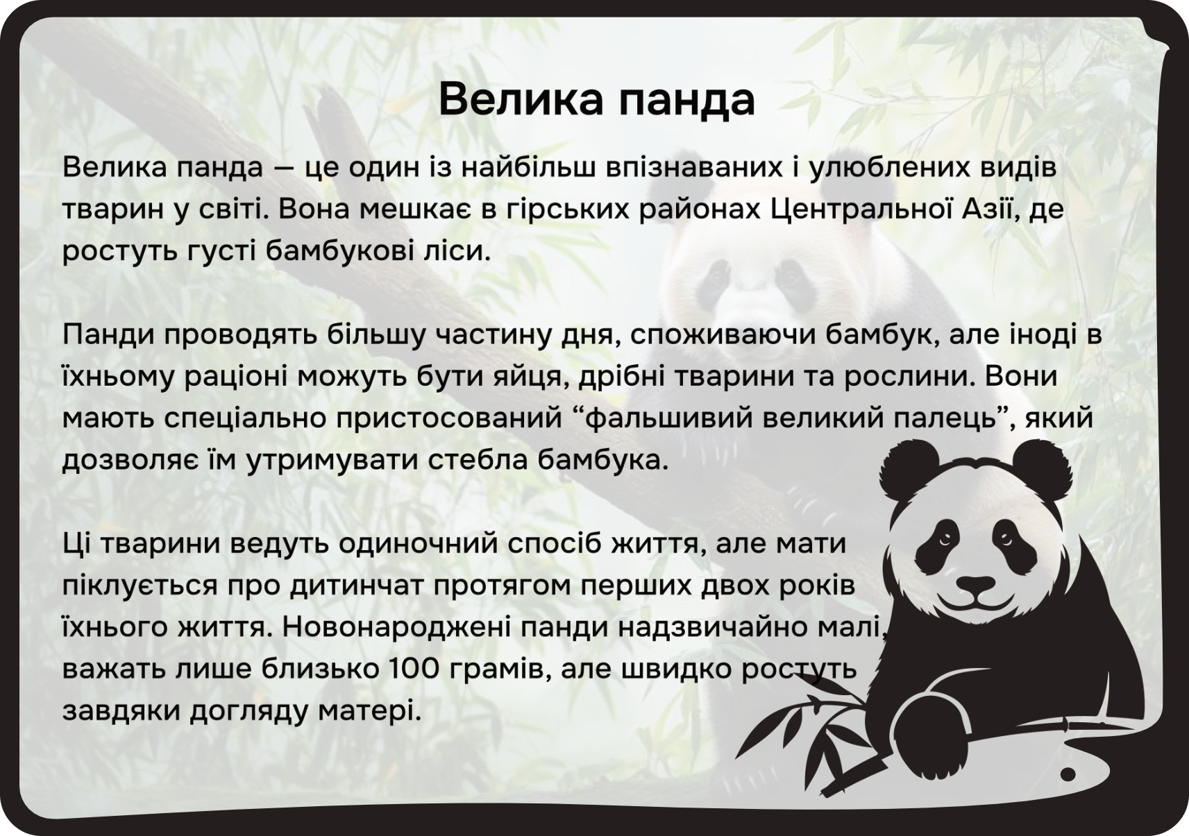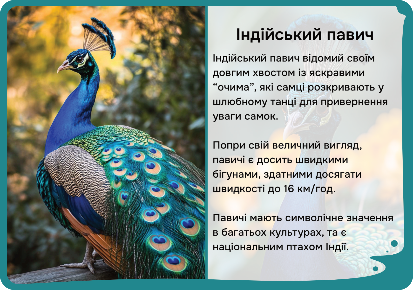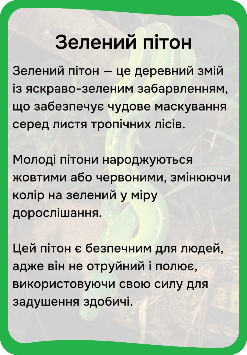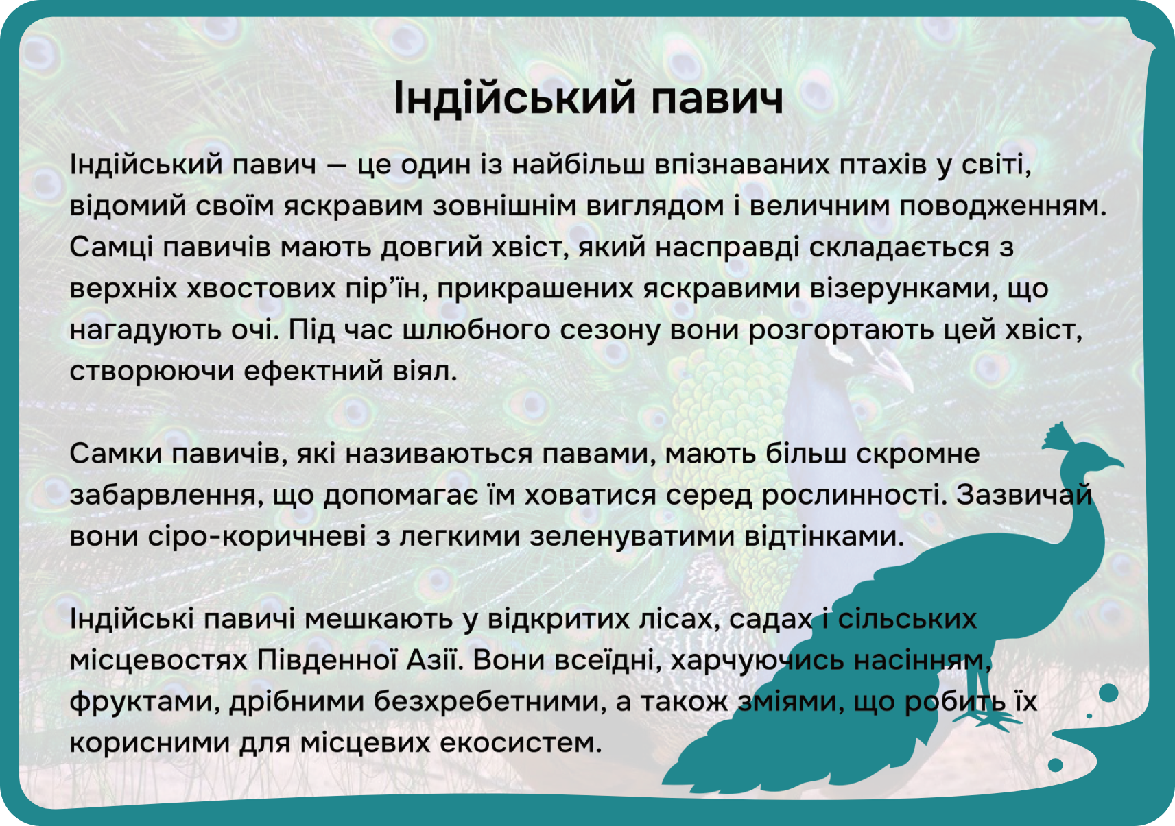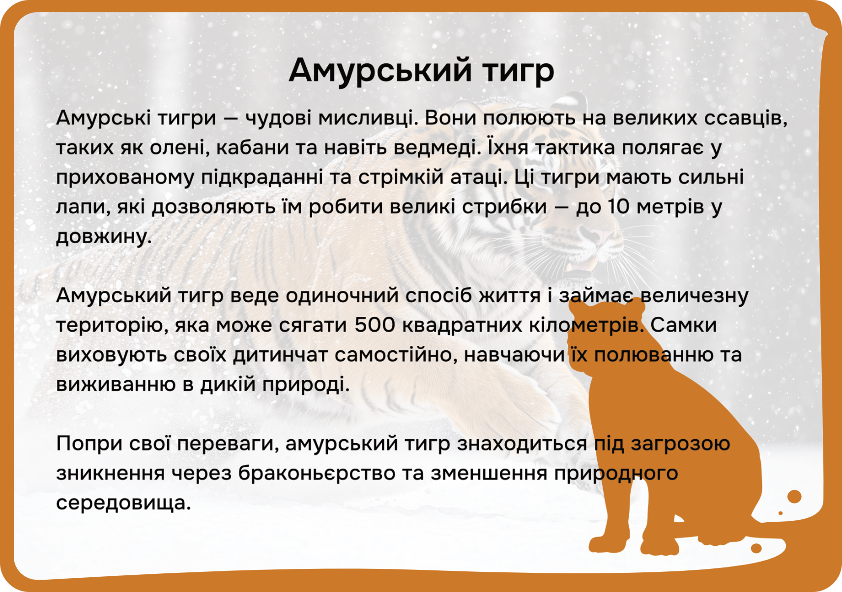 Завдяки яскравим ілюстраціям та цікавим описам діти дізнаються, як тварини пристосовуються до різних умов, чим вони харчуються, де живуть і які унікальні особливості роблять кожен вид неповторним. Ці картки розвивають допитливість, любов до природи та допомагають краще зрозуміти різноманіття життя на нашій планеті.