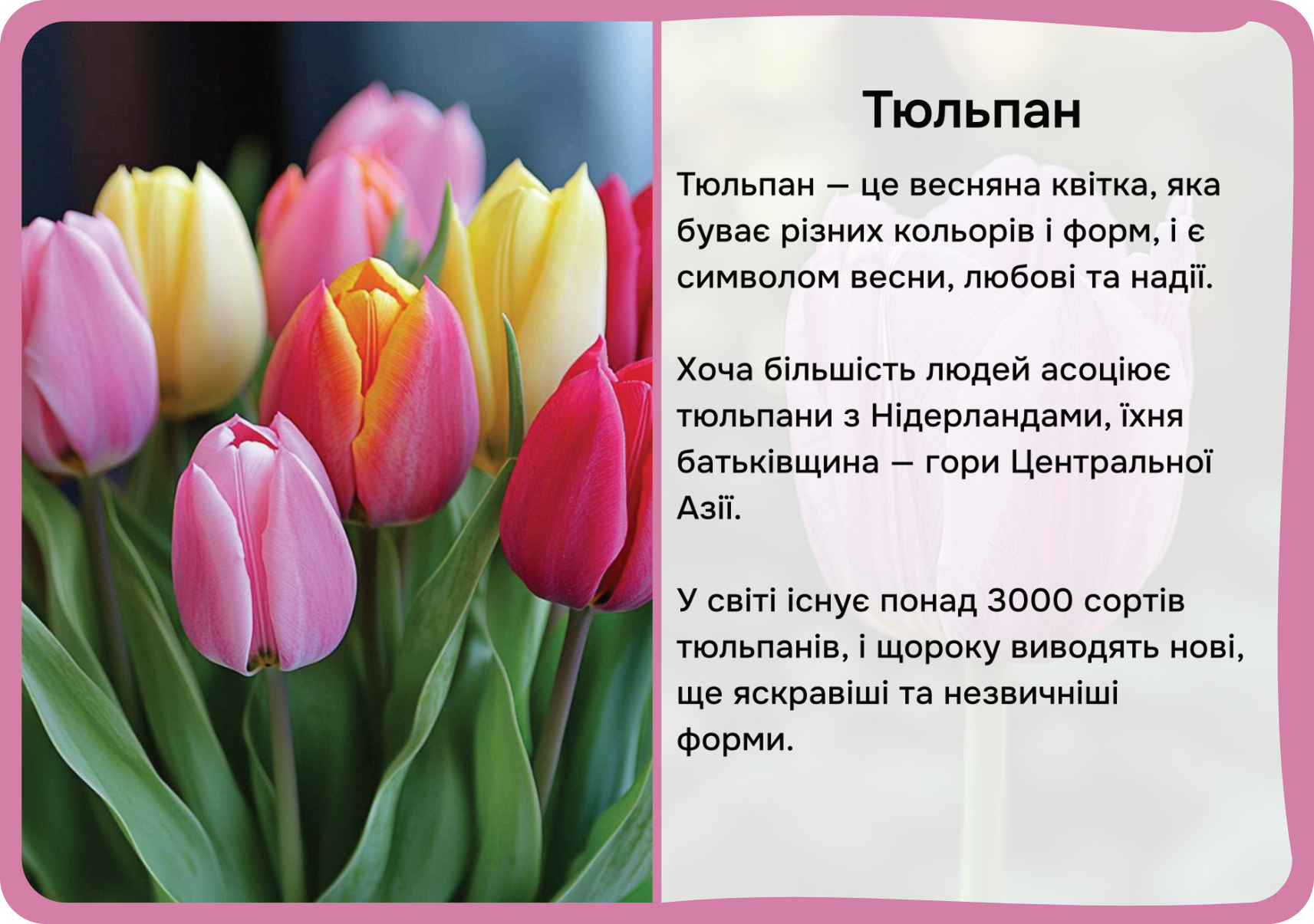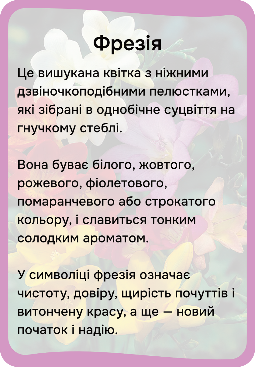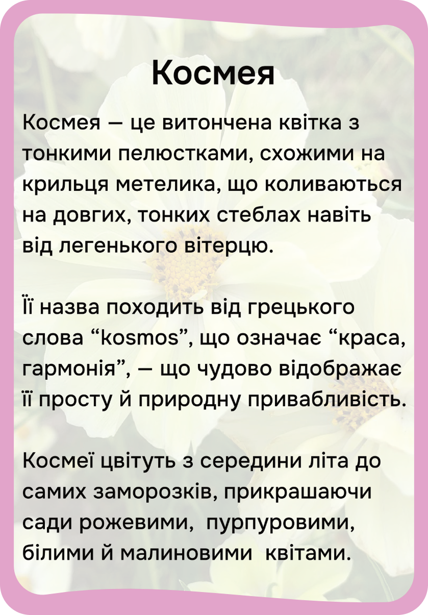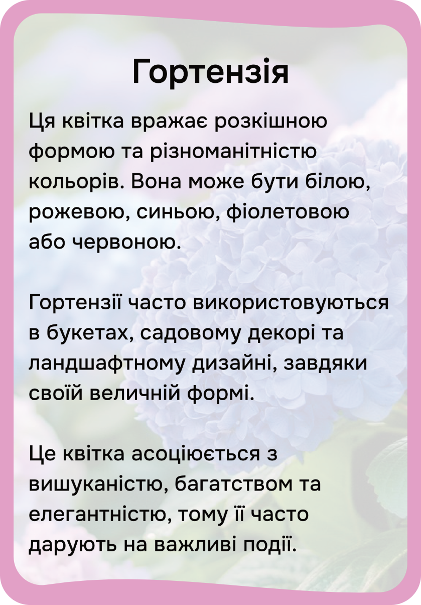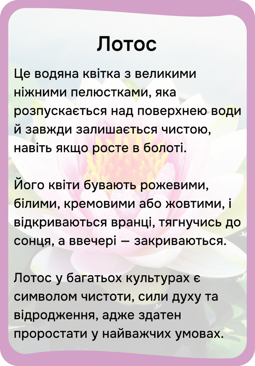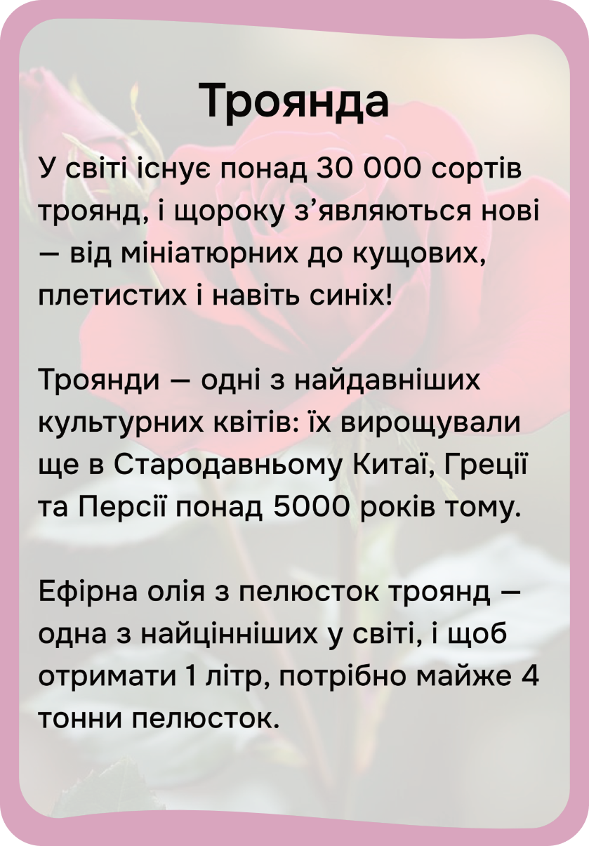 Пориньте у дивовижний світ природи разом із нашою серією карток про найкрасивіші та найцікавіші квіти світу! Кожна картка відкриває дитині нову історію — про походження, особливості та унікальні властивості кожної рослини.
